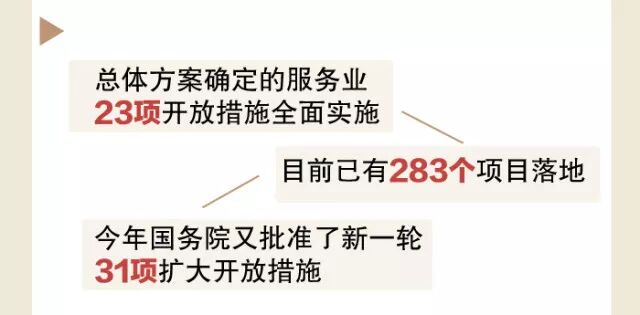 ○总体方案确定的服务业23项开放措施全面实施,并且建立了相应的监管制度和监管措施,目前已有283个项目落地。今年国务院又批准了新一轮31项扩大开放措施。