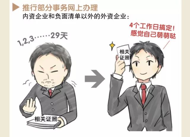 ○内资企业和负面清单以外的外资企业可在4个工作日内一并领取到相关证照,比原来的29个工作日大幅缩减