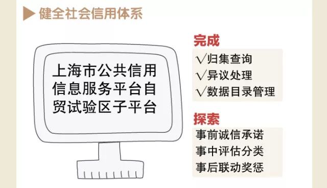○健全社会信用体系。目前,自贸试验区子平台已完成归集查询、异议处理、数据目录管理等功能开发工作,同时探索开展事前诚信承诺、事中评估分类、事后联动奖惩的信用管理模式。