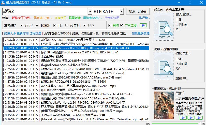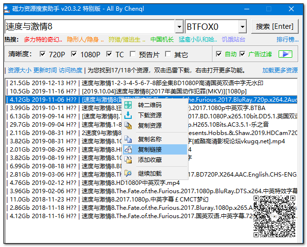 下面我们来用这款工具随便搜索一部电影,如下图所示,目的是为了测试下面的一款下载器效果如何。