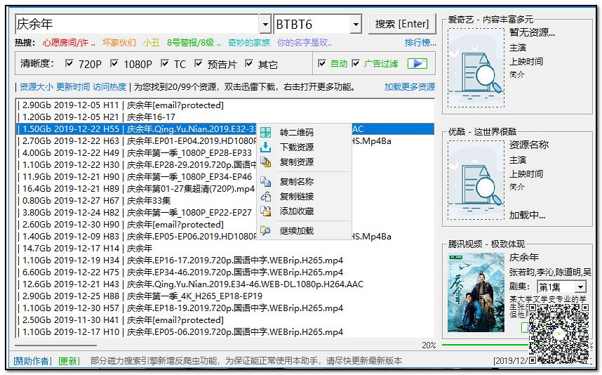 我们可以看到这个搜索器的左侧展示的是搜索的影视剧下载源,选中自己想要看的影视剧资源,鼠标右键可以看到下载资源、复制链接、添加收藏这些实用功能。