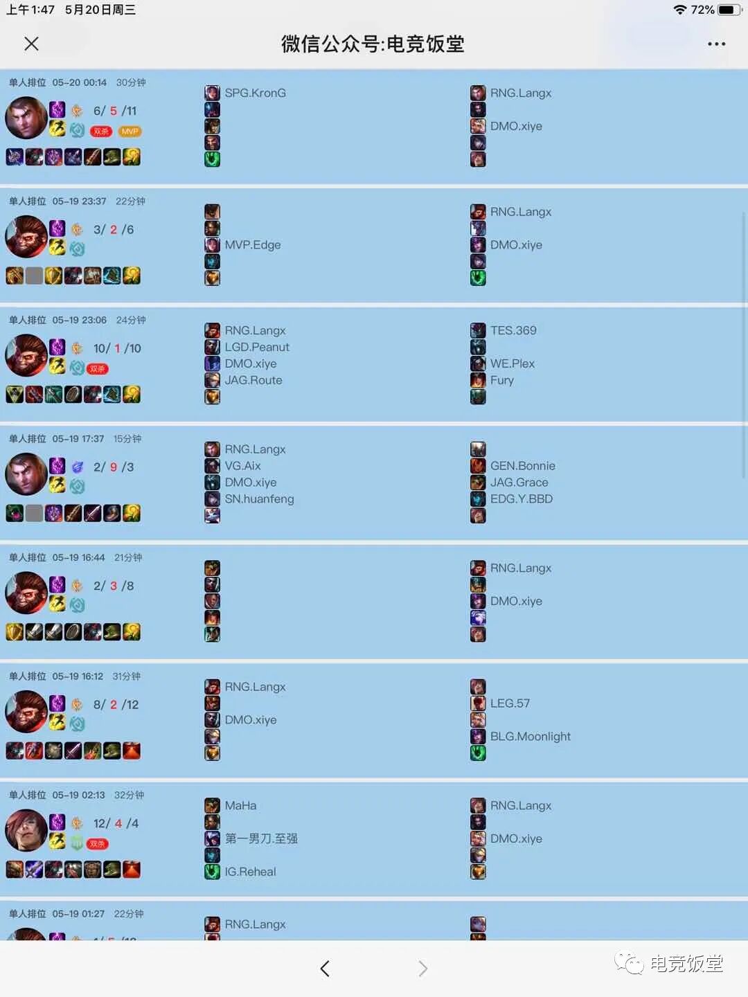 狼行已经基本确认离队无疑了,这是已经实锤的消息,饭堂仔细查了狼行的战绩,发现这两天他都在与xiye双排,而xiye之前已经传出要去LGD了,所以我们也能认为狼行应该也要加入LGD,果不其然,今天饭堂哥就发现了狼行也已经在LGD训练赛的名单里和xiye一起打的。。