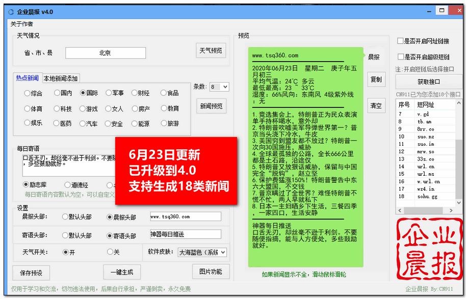本期神器妹分享一款微信晨报生成器专业版, 2020年6月23日更新,已升级到了4.0版 ,支持一键智能生成每日热点新闻、每日天气情况,每日寄语等等,非常适合微信群早报分享,活跃一下人气。