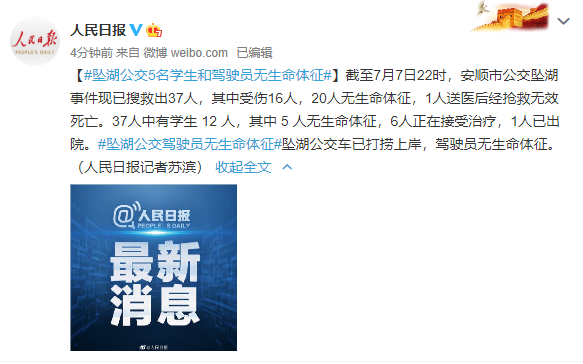 记者从贵州省安顺市应急管理局获悉:截至7月7日22时,安顺市公交坠湖事件现已搜救出37人,其中受伤16人,20人无生命体征,1人送医后经抢救无效死亡。37人中有学生 12 人,其中 5 人无生命体征,6人正在接受治疗,1人已出院。坠湖公交车已打捞上岸,驾驶员无生命体征。