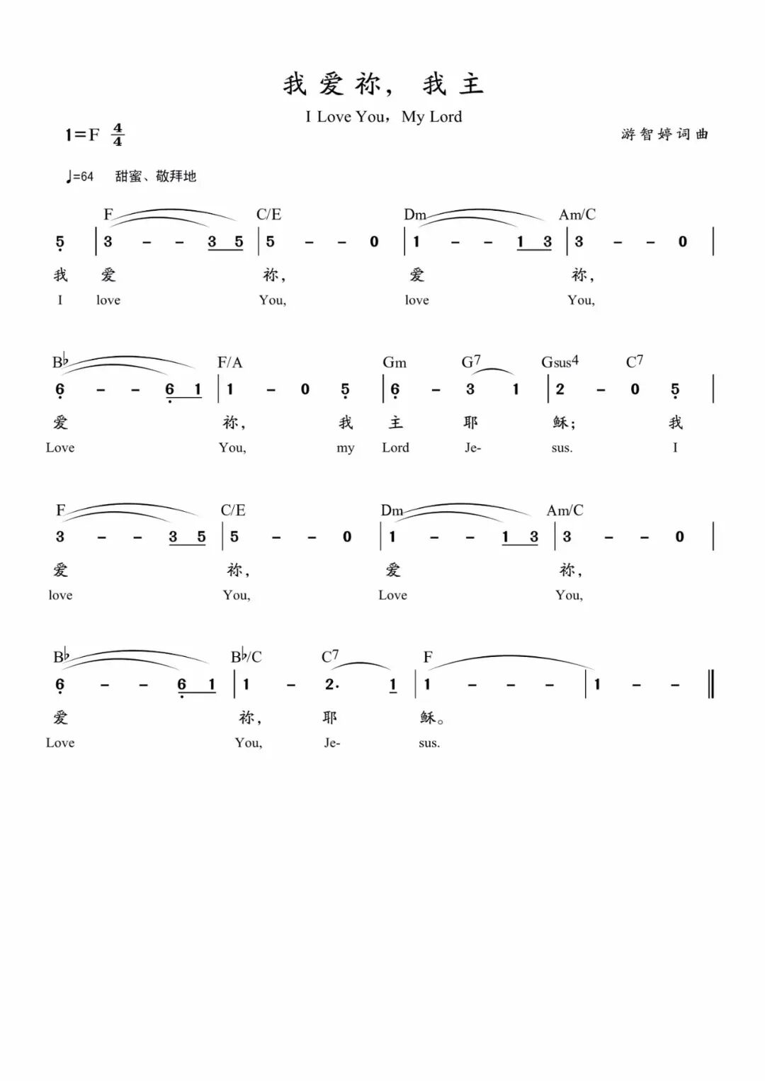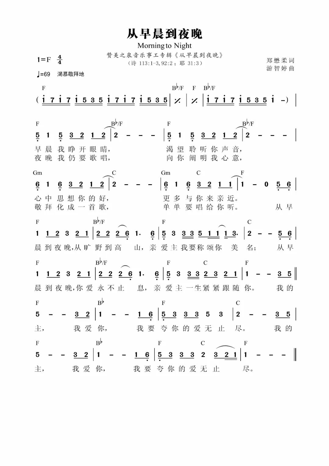 歌曲: 00:00 从早晨到夜晚 Morning to Night 词:郑懋柔 Tiffany M. Cheng 曲:游智婷 Sandy Yu © 2017 Stream of Praise Music / BMI. CCLI: 7125332 赞美之泉版权所有 [Verse] 早晨我睁开眼睛 渴望聆听你声音 心中思想你的好 更多与你来亲近 夜晚我仍要歌唱 向你阐明我心意 敬拜化成一首歌 单单要唱给你听 [Chorus] 从早晨到夜晚 从旷野到高山 亲爱主 我要称颂你美名 从早晨到夜晚 你爱永不止息 亲爱主 一生紧紧跟随你 [Bridge] 我的主 我爱你 我要夸你的爱无止尽 我的主 我爱你 我要夸你的爱无止尽 - - - - - - - - - - - - - - 05:15 我爱你,我主 I Love You, My Lord 词曲:游智婷 Sandy Yu © 2003 Stream of Praise Music/BMI. CCLI: 3978083 赞美之泉版权所有 [Verse] 我爱你 爱你 爱你 我主耶稣 我爱你 爱你 爱你 耶稣