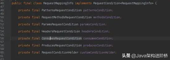 有各种RequestCondition实现类属性,patternsCondition,methodsCondition,paramsCondition,headersCondition,consumesCondition以及producesCondition,这个请求条件看属性名也了解,分别代表http请求的路径模式、方法、参数、头部等信息。