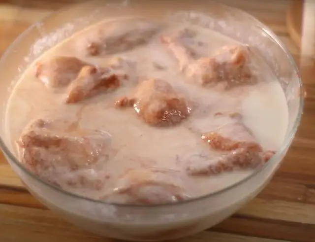 调好的香料平均涂抹在鸡肉上后加在牛奶盆里用保鲜膜放在冰箱内一个晚上。