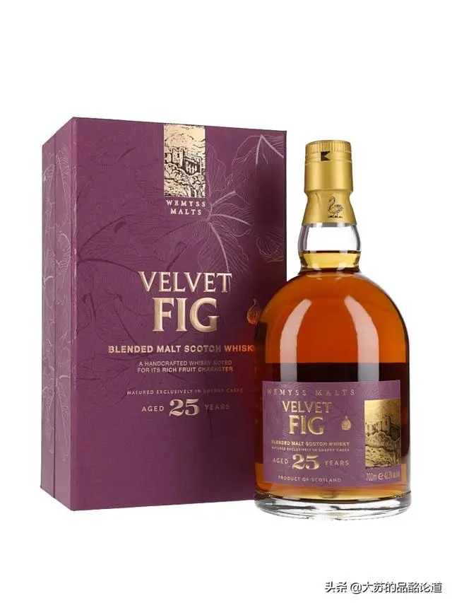 这款酒属于纯麦型威士忌(Blended Malt Scotch Whisky),出自独立装瓶商Wemyss Malts,最早于2014年推出,由来自苏格兰高地、斯卑塞和艾雷岛的麦芽威士忌混合而成,并于2015年获得WWA最佳苏格兰混合麦芽威士忌的殊荣。2019年,该酒厂从高地和斯卑塞(具体酒厂没有公布)获得了5桶1994年蒸馏入桶的威士忌和15桶艾雷岛布纳哈本(Bunnahabhain)1988年蒸馏入桶(雪莉桶)的非泥煤威士忌。Wemyss Malts将它们混合后再装入再填雪莉猪头桶(refill sherry hogsheads)收尾16个月,之后装瓶上市。酒龄虽然标注25年,但绝大多数的酒液实际已经超过30年。遗憾的是,这么一款性价比超级高的酒(仅为149美元)目前国内没有引入。