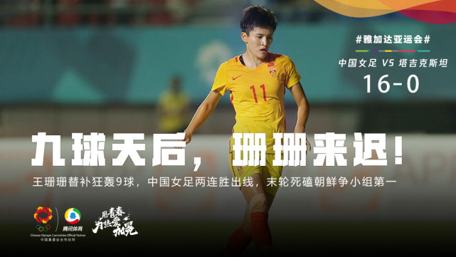 中国女足提前出线:首轮7-0大胜中国香港,本场比赛又16-0狂扫塔吉克斯坦,中国队迎来两连胜,提前一轮小组出线。 王珊珊替补进九球:下半场,替补出场的王珊珊独进9球,一跃成为队内最佳射手。 赵容完成五子登科:本场比赛,后卫赵容一人打进五球完成“五子登科”,同样是中国女足获胜的功臣。 女足追平赢球纪录:20年前曼谷亚运会小组赛,中国队曾以16-0狂胜印度队。如今,中国队追平了球队亚运会赢球比分纪录。精彩瞬间