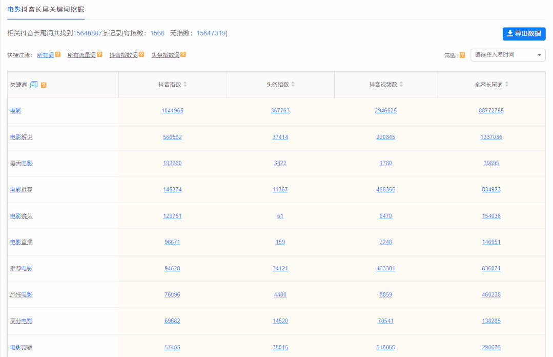 关键词:基于所有抖音用户的搜索行为产生的数据,点击可继续挖掘该词的长尾词。