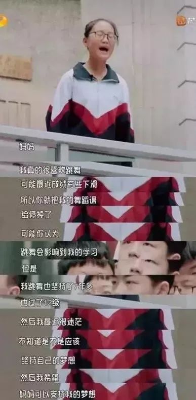 《少年说》里,有个女孩因为成绩下滑,被母亲停掉了舞蹈班。她说自己非常喜欢跳舞,成绩下滑并不是因为跳舞,希望母亲支持她的梦想。