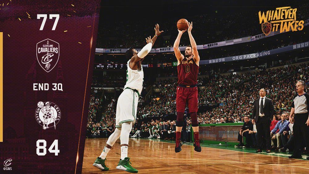 第三节詹姆斯汤普森乐福相继得分,骑士一波6-4开局,但凯尔特人连得4分不得不让骑士叫暂停调整。凯尔特人追身三分,詹姆斯直接横移还一个让骑士稳住5分的领先优势。凯尔特人再次追分,本节还有6分钟时双方战成66平。这时乐福接詹姆斯传球快速三分,绿军也打成2+1再次追平。